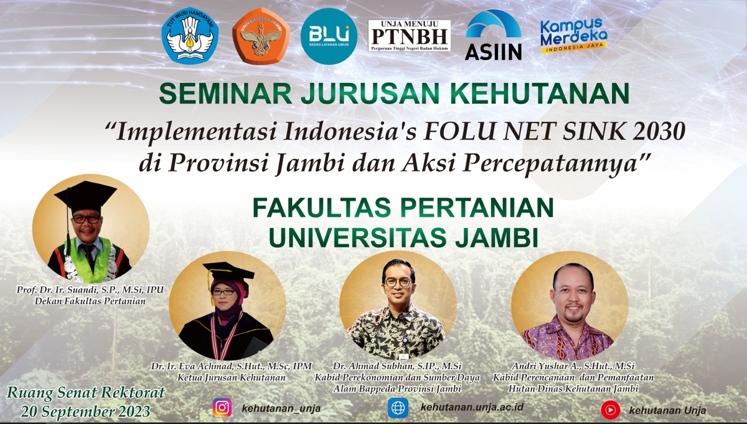 Kegiatan seminar yang dilaksanakan oleh Jurusan Kehutanan ini diselenggarakan pada Hari Rabu Tanggal 20 September 2023 di ruang rapat senat Universitas Jambi ini menghadirkan dua orang pembicara yaitu Dr. Ahmad Subhan, S.IP., M.Si dari Bappeda Provinsi Jambi dan Ahmad Yushar, S.Hut., M.Si dari Dinas Kehutanan Provinsi Jambi.